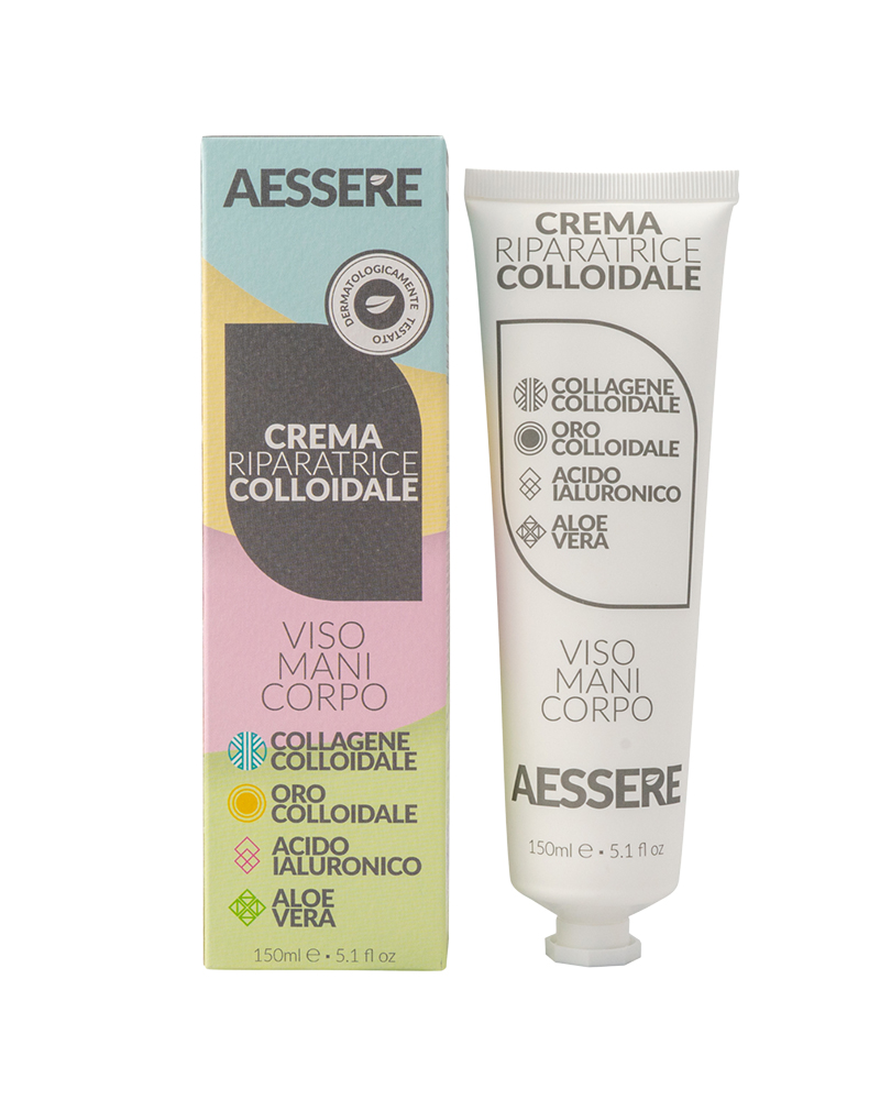 Crema riparatrice colloidale VISO MANI CORPO è un cosmetico rivoluzionario che riunisce in una texture unica tutte le proprietà dell’aloe con la massima efficacia del collagene colloidale, dell’oro colloidale e dell’acido ialuronico.