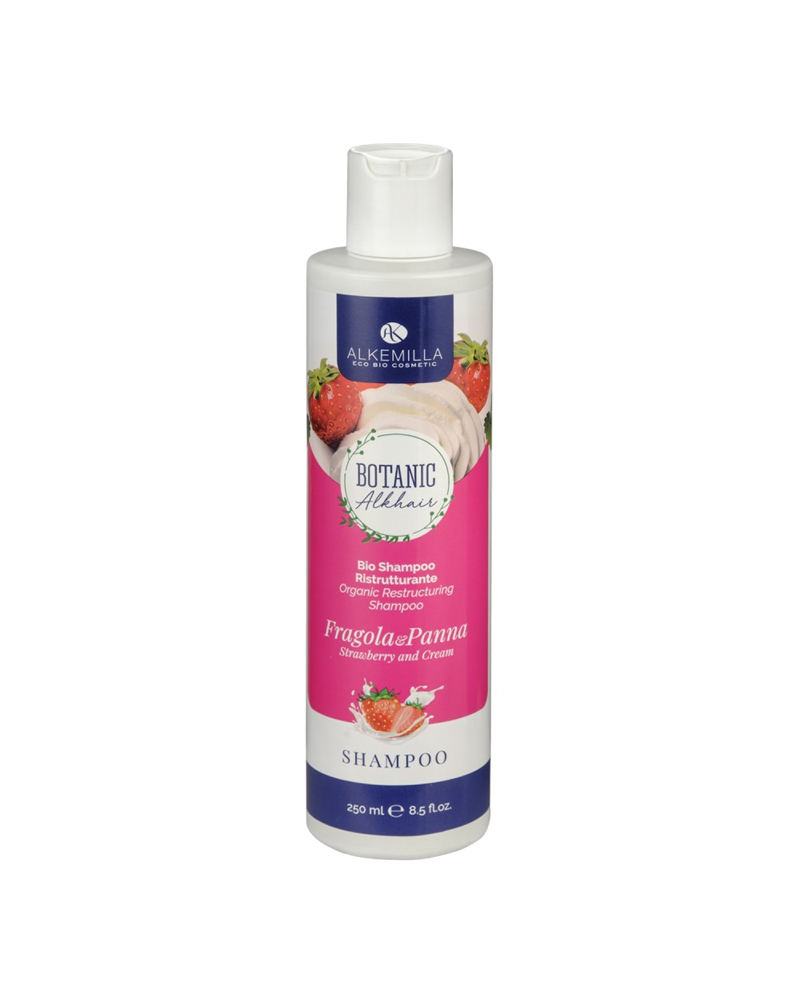 Shampoo bio ristrutturante e nutriente con panna, fragola e semi di lino bio. Deterge dolcemente e dona morbidezza e forza ai capelli danneggiati e secchi.