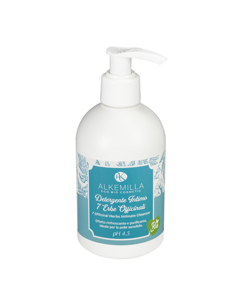 Detergente intimo eco-bio con estratti di 7 erbe officinali e aloe vera biologica. Deterge con delicatezza, protegge e rinfresca, rispettando il pH fisiologico femminile.