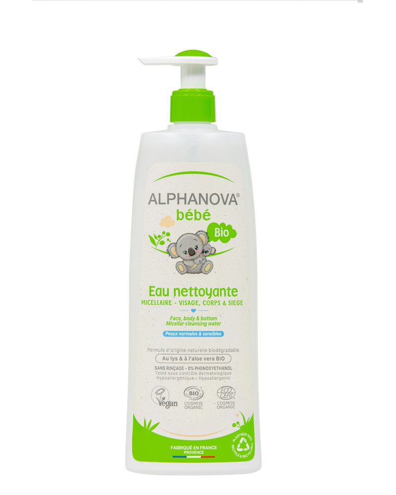 Acqua detergente senza risciacquo ALPHANOVA bebè ® per il cambio e il lavaggio del bambino. Adatta per la pelle secca e molto sensibile di neonati e bambini, ideale per un uso quotidiano.