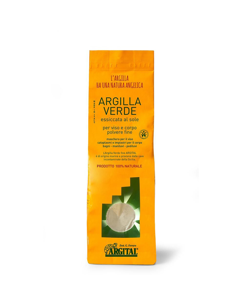 Argilla verde essiccata al sole, polvere fine per viso, corpo e capelli.