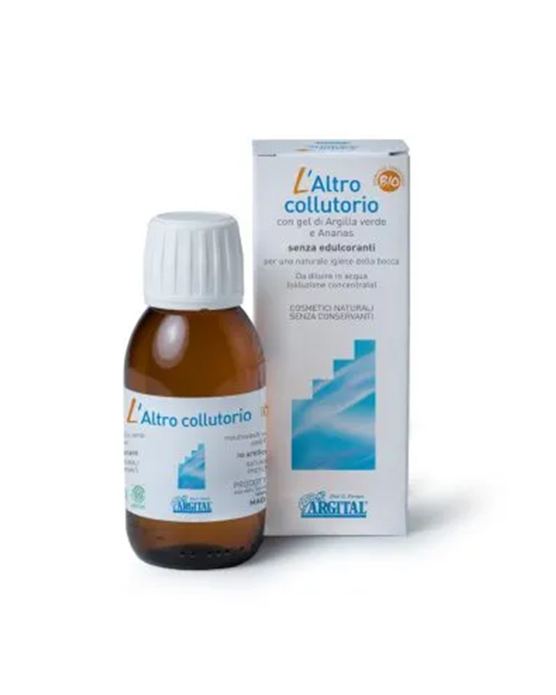 L’Altro collutorio è un prodotto naturale che contiene gel di Argilla verde, acqua d’Argento, estratto di Ananas, estratti di Ratania e di Calendula, puri oli essenziali Gold.