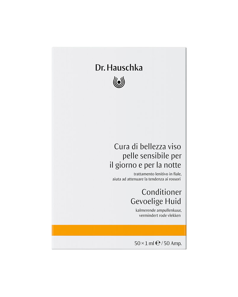 La Cura di bellezza viso pelle sensibile per il giorno e per la notte è un trattamento in fiale privo di grassi che favorisce la naturale autorigenerazione cutanea notturna e calma i rossori. La composizione con estratti ritmizzati di borragine, perla, malachite e corteccia di quercia rinforza e decongestiona, aiutando a prevenire l’ulteriore dilatazione capillare. Ideale come impulso normalizzante quando la pelle è reattiva o dopo stress (sole, epilazione).