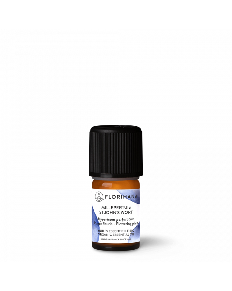 Olio essenziale biologico 100% puro ottenuto per distillazione in corrente di vapore della sommità fiorita di Hypericum perforatum. Fragranza erbacea con sfumature fruttate e speziate.