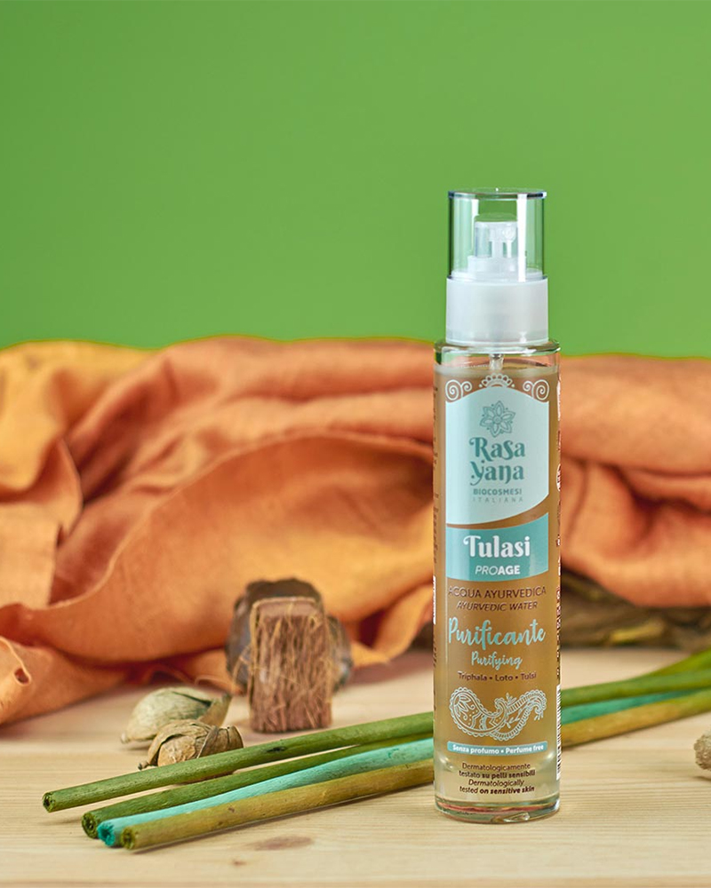 Tulasi è un’Acqua ayurvedica ProAge ad azione purificante, adatta per viso e capelli.