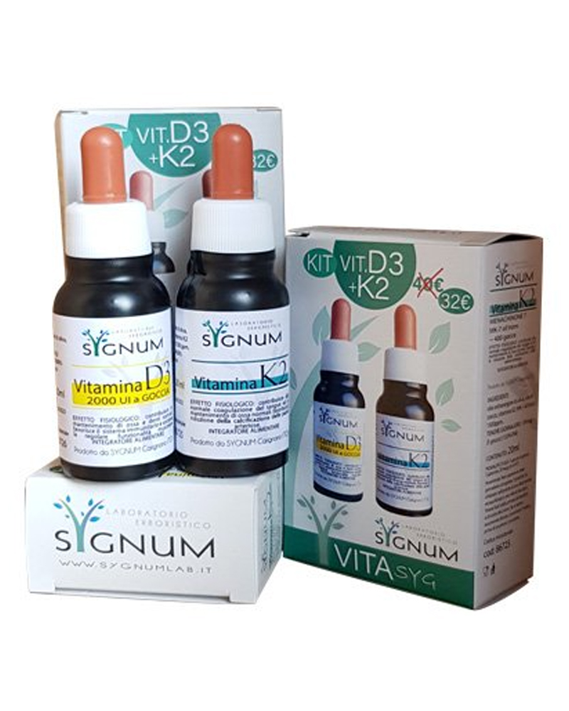 Il Kit Vitamina D3 + K2 di Sygnumlab combina due nutrienti sinergici fondamentali per il benessere dell’organismo. La vitamina D3 (colecalciferolo) aiuta l’assorbimento di calcio e fosforo, sostiene ossa, denti, muscoli e sistema immunitario. La vitamina K2 MK7 (menachinone-7 all-trans) guida il calcio verso il tessuto osseo e ne impedisce il deposito nei vasi sanguigni, sostenendo la salute vascolare e ossea.
