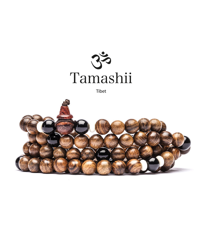 Mala Tibetana Legno Hua Qi Nanmu, Onice Nero e Agata Bianca