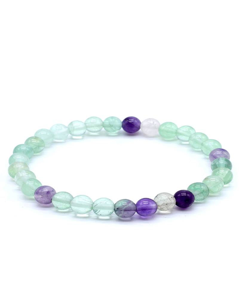 Bracciale in Fluorite naturale multicolore (perle da 6 mm), montato su elastico resistente. Una pietra arcobaleno che armonizza mente, emozioni e intuizione.