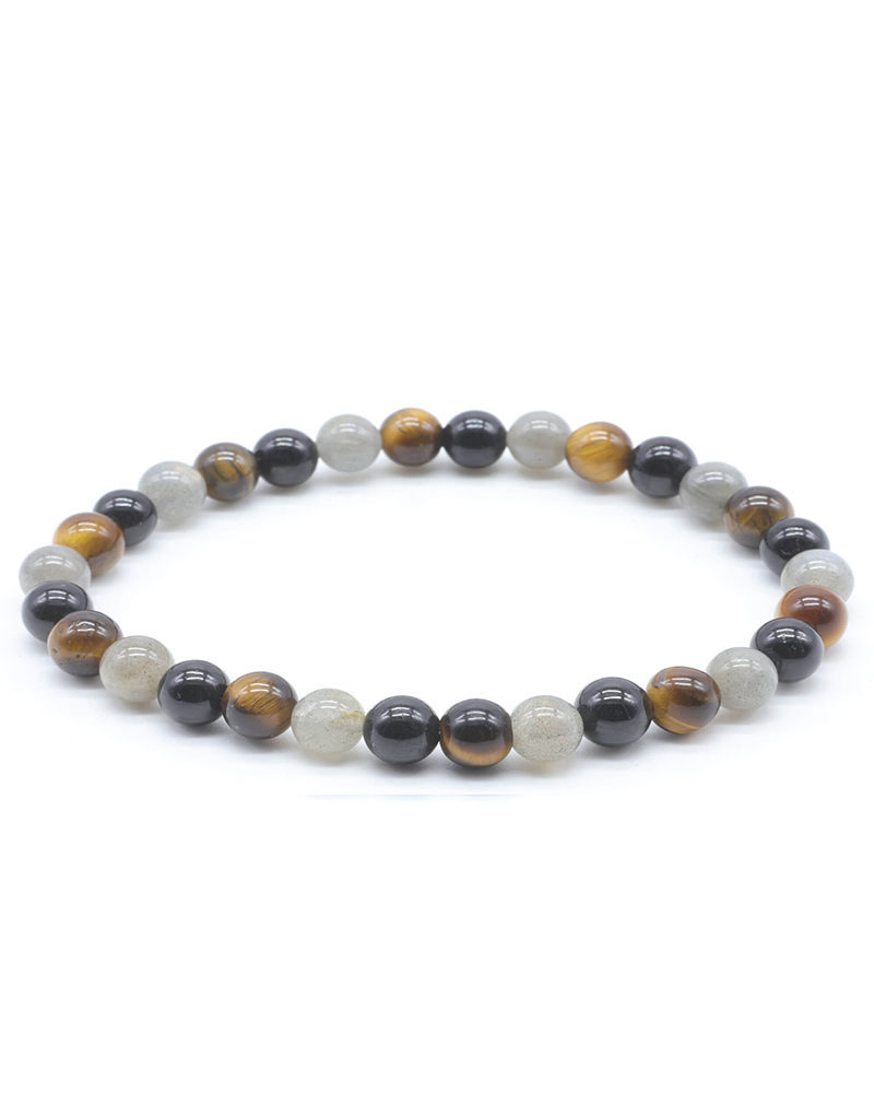 Insieme creano un equilibrio armonico tra i tre livelli energetici fondamentali: spirituale (Labradorite), mentale (Occhio di Tigre) e fisico (Tormalina Nera).