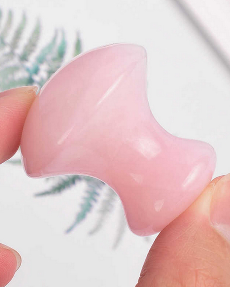 Aggiungi il Gua Sha Champignon in Quarzo Rosa alla tua routine di bellezza per sfruttare i benefici della litoterapia e migliorare l'aspetto della tua pelle in modo naturale e rilassante.
